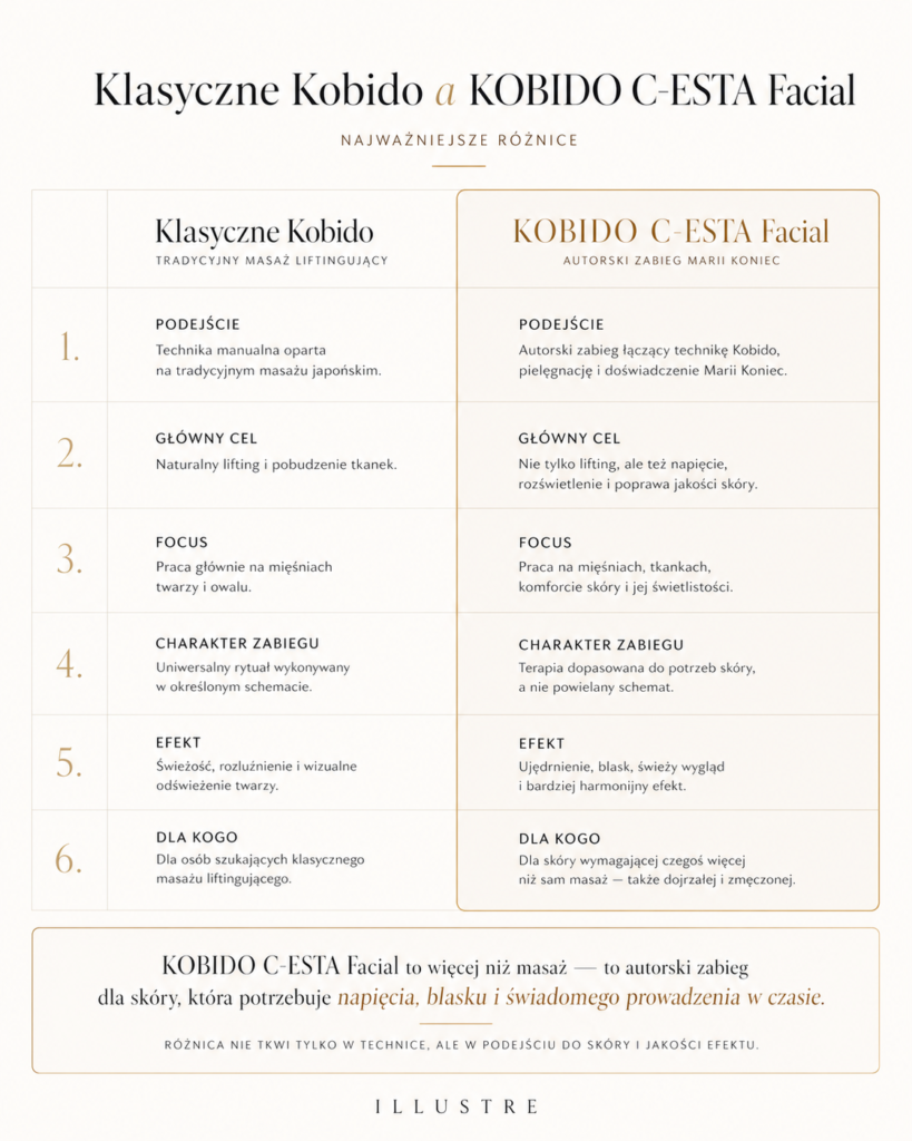 Najprościej można powiedzieć tak: klasyczne Kobido koncentruje się przede wszystkim na technice masażu, a KOBIDO C-ESTA Facial w Illustre idzie krok dalej — łączy technikę, pielęgnację, doświadczenie i autorską filozofię pracy ze skórą.